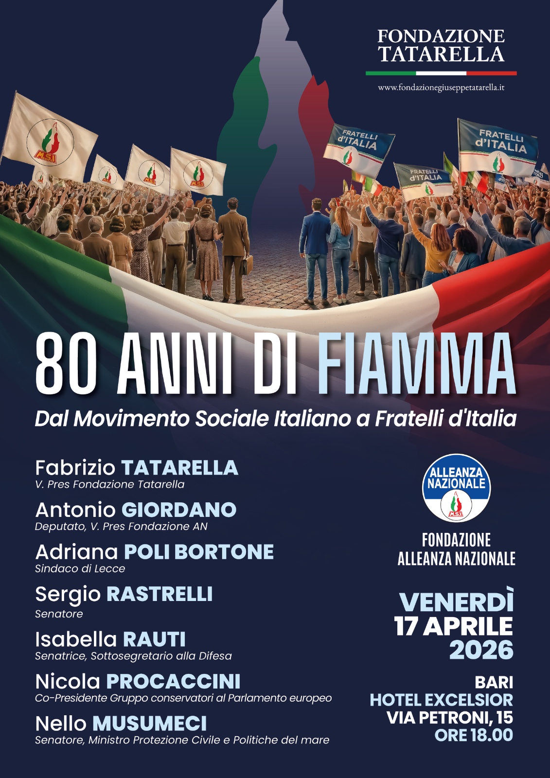 Al Convegno “80 ANNI DI FIAMMA" che si terrà venerdì 17 aprile p.v. alle ore 18.00 a Bari presso l'Hotel Excelsior in Via G. Petroni, 15 parteciperanno: